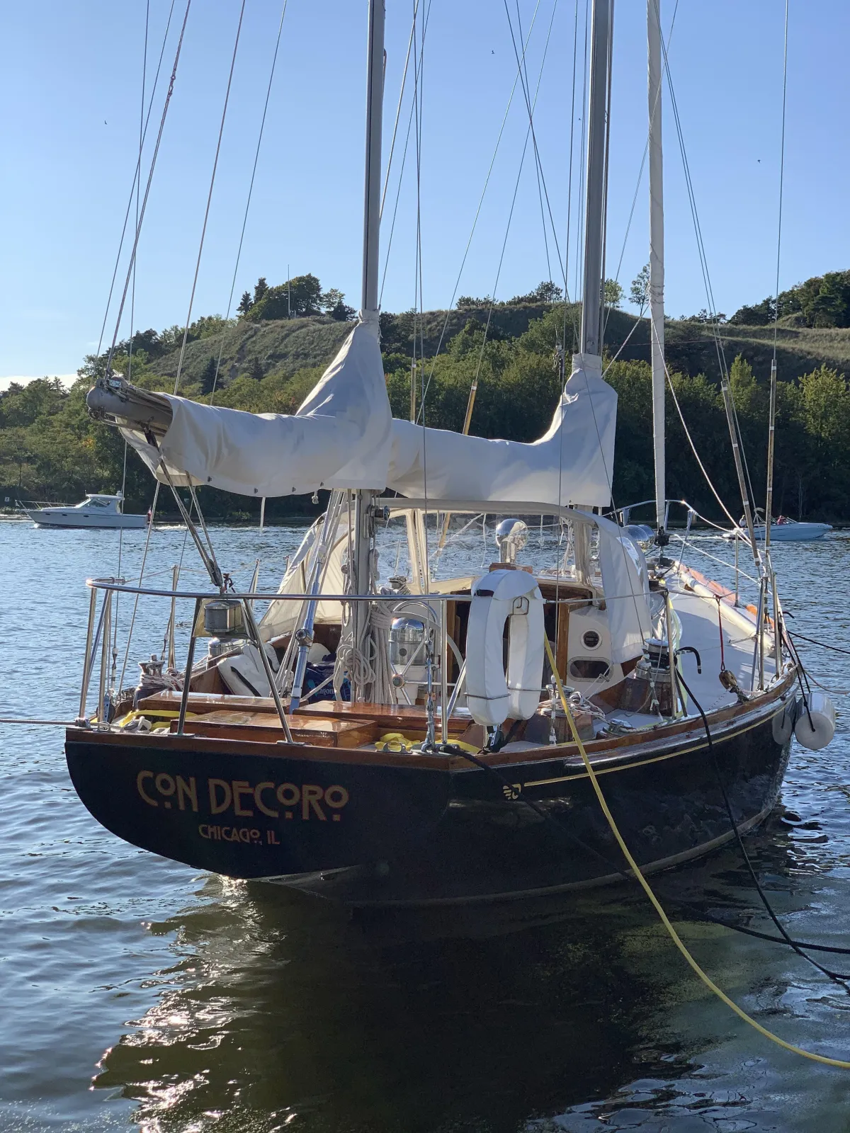 The Bermuda 40's iconic exterior profile is immediately recognizable to any sailing enthusiast. Here, you can admire every sweeping curve, brilliant varnished surface, and intricate detail that makes this design so enduringly special.